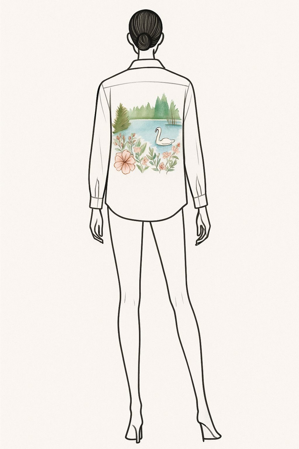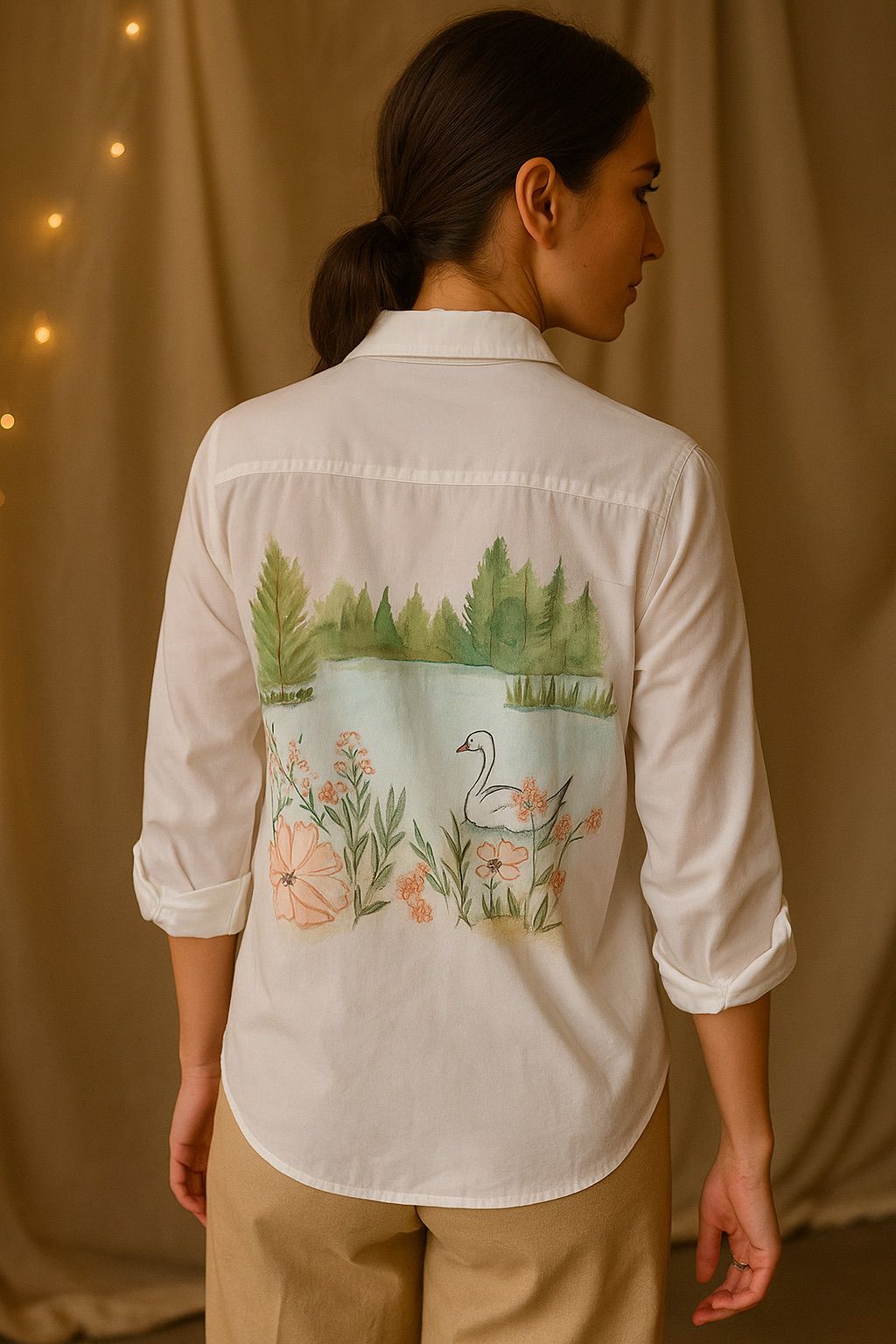 A delicate swan glides through a painted pond, nestled beneath hand-brushed mountains & silent skies. This is not just a shirt - it's a moment captured in motion. Embroidered in the front & painted at the back.